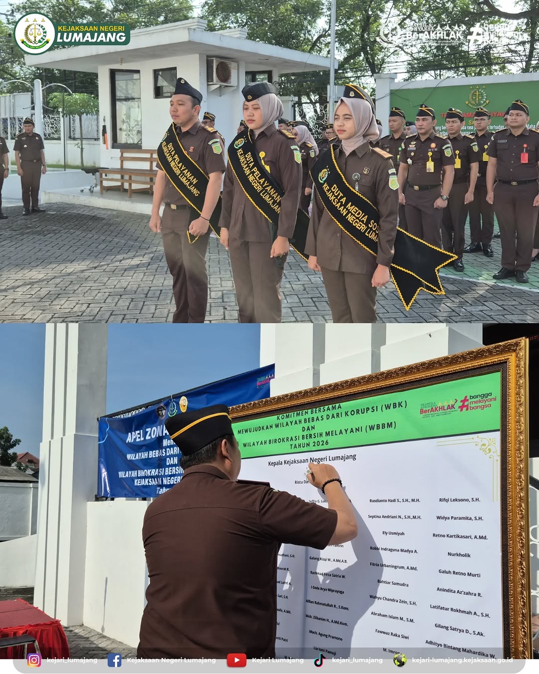 Bertempat di Halaman Kejaksaan Negeri Lumajang, Kepala Kejaksaan Negeri Lumajang Bapak Ristu Darmawan menjadi Pembina Apel Zona Integritas menuju WBK dan WBBM Kejaksaan Negeri Lumajang tahun 2026.