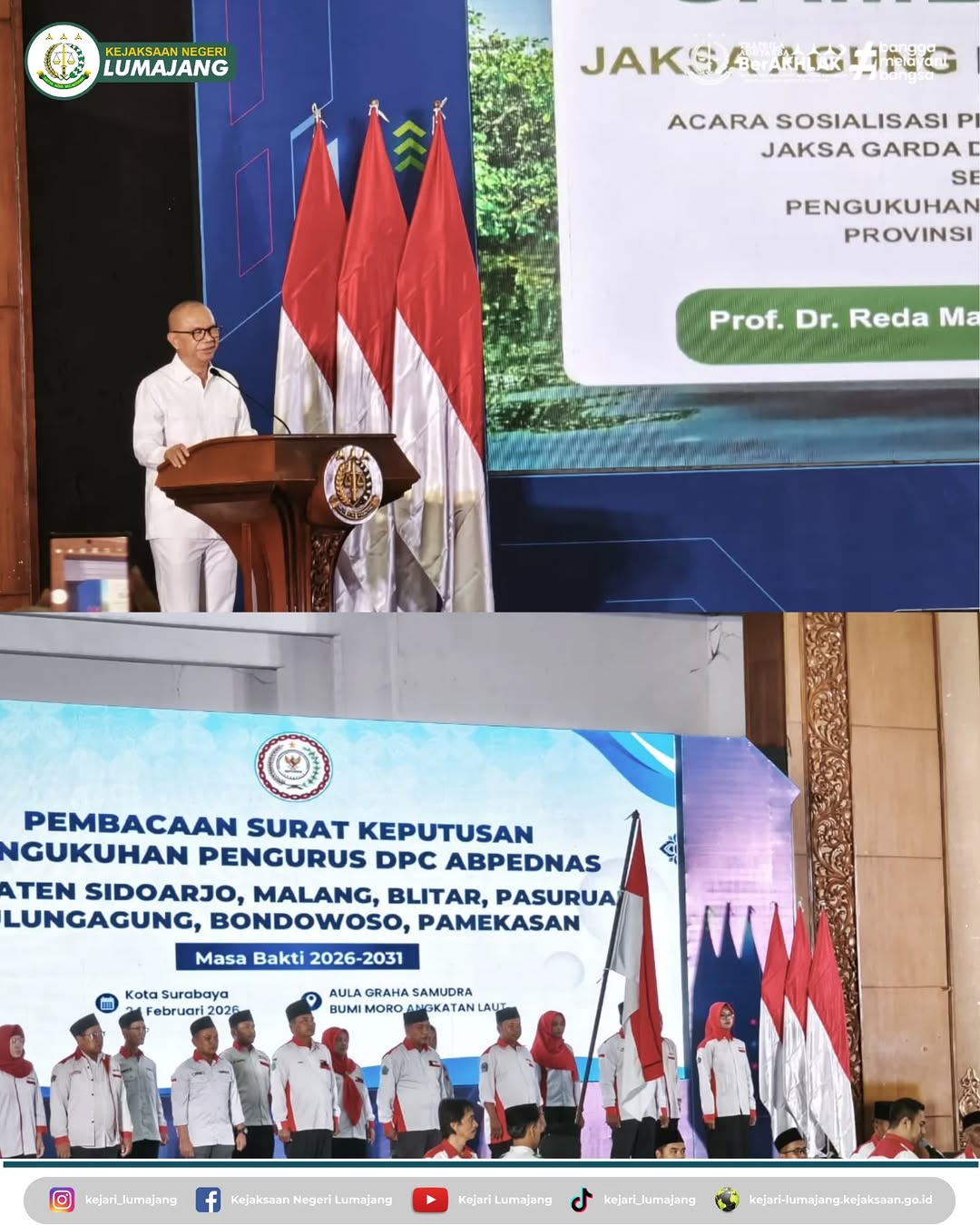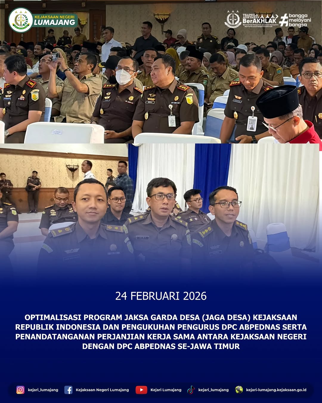 Bertempat di Graha Samudera Bumimoro (Komplek Komando Pendidikan TNI AL Jalan Moro Krembangan, Kecamatan Krembangan, Surabaya, Jawa Timur) Kepala Kejaksaan Negeri Lumajang didampingi Kepala Seksi Intelijen menghadiri kegiatan Optimalisasi Program Jaksa Garda Desa (Jaga Desa) Kejaksaan Republik Indonesia dan Pengukuhan Pengurus DPC ABPEDNAS serta Penandatanganan Perjanjian Kerja Sama antara Kejaksaan Negeri dengan DPC ABPEDNAS Se-Jawa Timur.