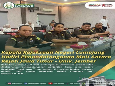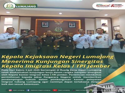 Pada hari Kamis 3 Juli 2025 bertempat di Ruang Kerja Kajari Lumajang telah dilaksanakan kunjungan ke ...