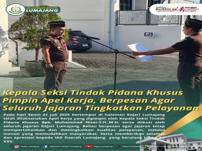Pada hari Senin 21 Juli 2025 bertempat di halaman Kejari Lumajang telah dilaksanakan Apel Kerja yang ...